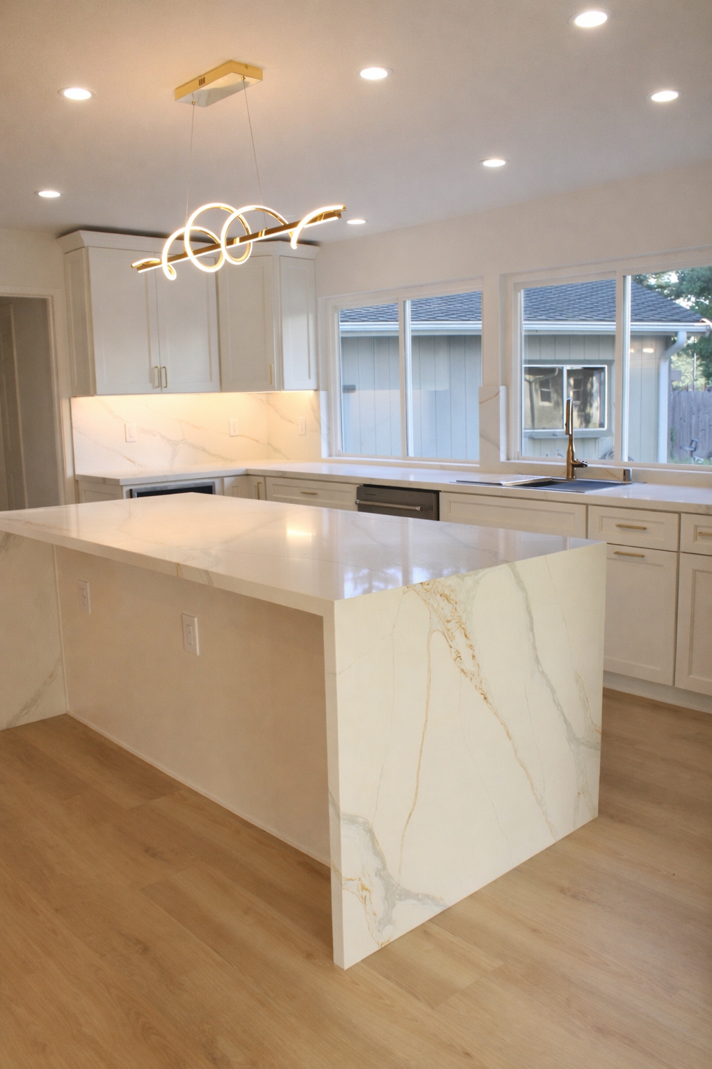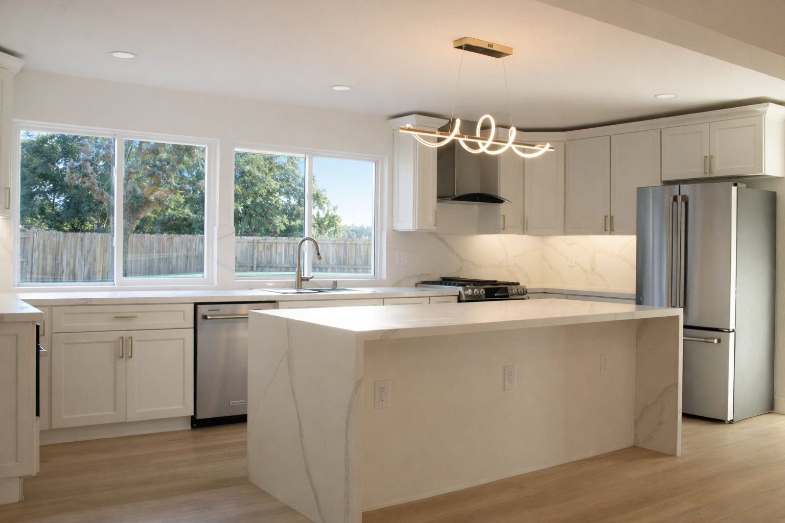 The highlight of this remodel is the stunning double waterfall countertops, which add a bold and elegant statement to the kitchen. Combined with high-end finishes and modern design elements, the new kitchen offers both beauty and everyday functionality.